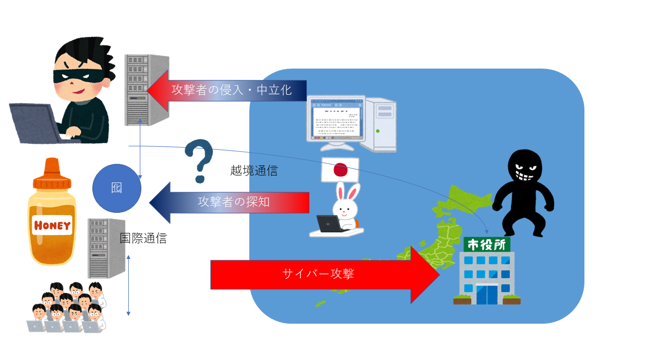 国際的な通信を取得するためのハニーポットを海外に設置するとか××なデコイをおいて攻撃者の活動を監視(内容をみることも含む)するとかというのは、国として可能な作戦ということになります。このようなイメージです。