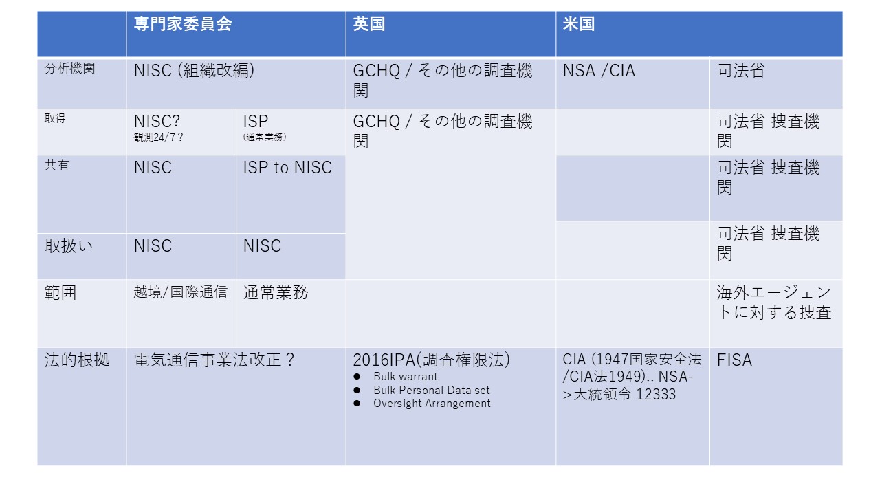 と評価していいと思います。一番の問題点は、この議論が、24/7の監視の問題を論じている(インテリジェンス機関の導入等) のか、ISPの情報取得を前提として、その政府への共有を論じている/また、法執行機関による積極的な対応(ボット無害化等)のかが、わからない、ということかと思います。