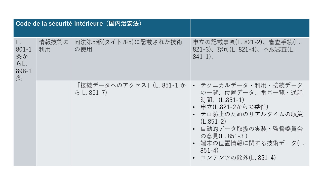 Code de la sécurité intérieure(国内治安法)の立法部分の第8編は、L. 801-1条からL. 898-1条において、情報に関する規則を定めています。議論された具体的な内容は、情報収集技術の利用・「接続データへのアクセス」ず。具体的には、以下の図になります。