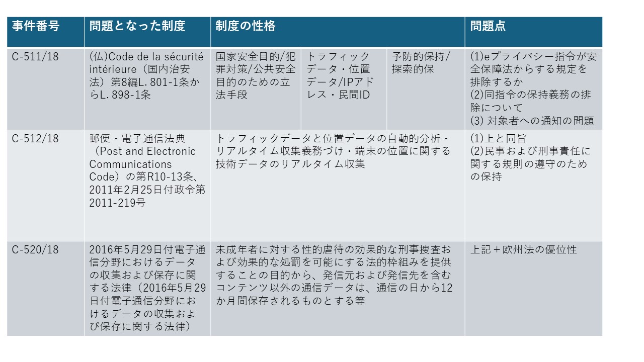 C-511/18の当事者の間で、郵便・電子通信法典(Post and Electronic Communications Code)の第R10-13条、2011年2月25日付政令第2011-219号(オンライン上に掲載されたコンテンツの作成に貢献した人物を特定できるデータの保存および伝達に関する政令、等の適法性が争われたものです。