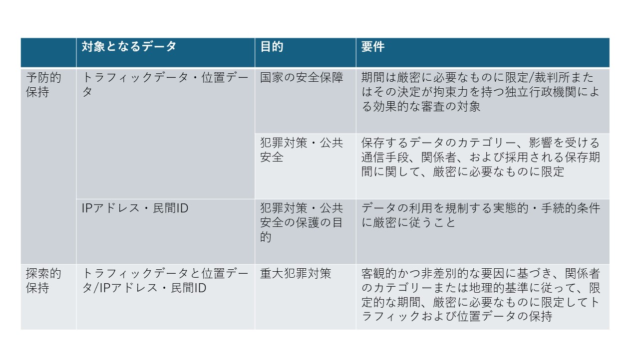 - 国家の安全保障の保護、重大な犯罪の取締り、公共の安全に対する重大な脅威の防止を目的として、インターネット接続のソースに割り当てられたIPアドレスを、厳密に必要な期間に限定して、一般的に無差別に保持すること。