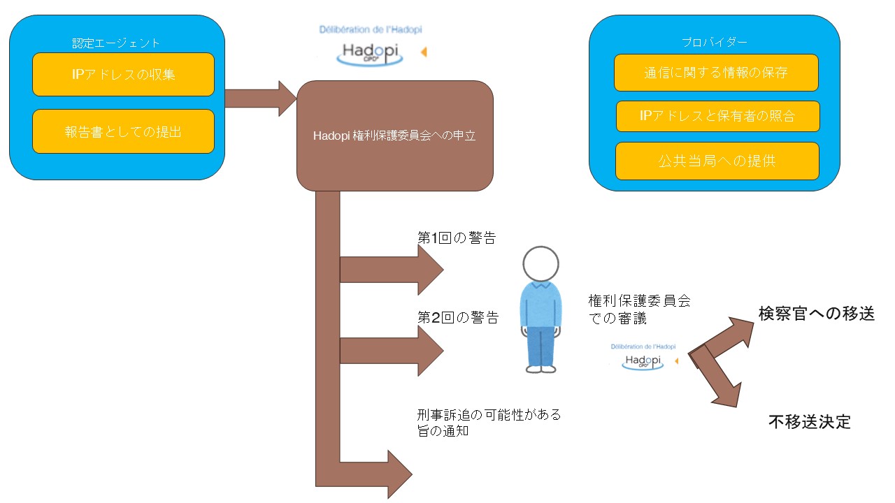 - 同法典第 L. 331-21 条は、Hadopiの権限について手続きの目的上必要であれば、保存および処理されたデータを含む、いかなる文書も、その保存媒体に関わらず電気通信プロバイダーから入手することができる。特に、電子通信事業者から、権利保有者の許可なく、保護された著作物または主題の複製、表示、公衆への提供、公衆への伝達を目的としてオンライン公衆通信サービスへのアクセスが利用された利用者の身元、住所、電子メールアドレス、電話番号を取得することができるとしています(23)。