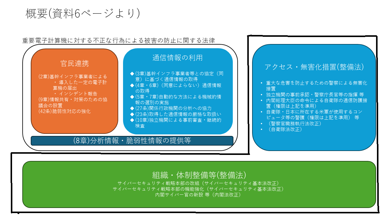 このうち、官民連携・通信情報の利用・組織体制整備等については、前のブログ「「重要電子計算機に対する不正な行為による被害の防止に関する法律案」等を読む(通信情報の利用等)」で検討してみました。