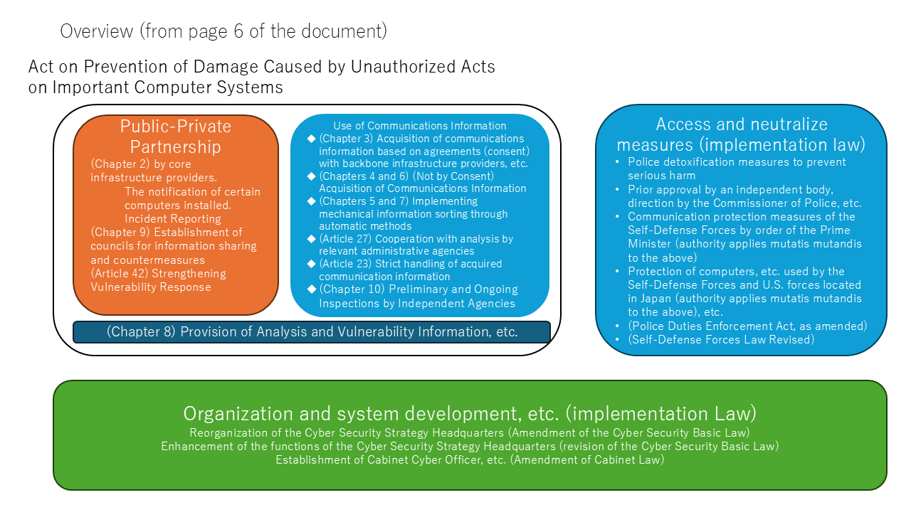 My blog on this topic is quite extensive, so for now, I will refer you to the entry titled ‘Active Cyber Defence – Recommendations for Improving Response Capabilities in the Field of Cyber Security (Part 1) – Strengthening Public-Private Partnerships.’(Japanese) I would like to examine the bill in detail.