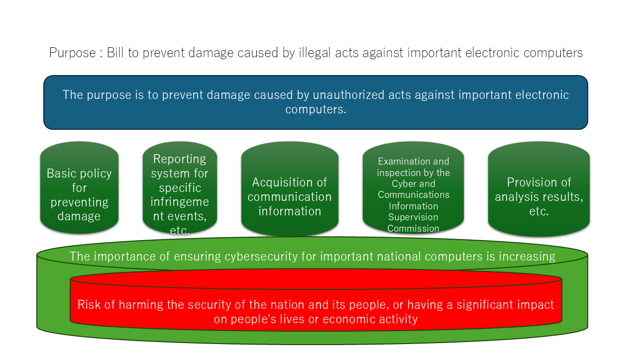 This law is enacted in recognition of the increasing importance of ensuring the cybersecurity of important electronic computers of the state and other entities, given that the cybersecurity of such systems may be compromised due to the development of the Internet and other advanced information and communications networks, the advancement of information and communications technology, the complexification of the international situation, and other factors, thereby posing a risk of harming the safety of the state and its citizens or causing significant impacts on citizens’ lives or economic activities. The bill aims to:a system for reporting specific cyber incidents by designated social infrastructure operators, the acquisition of communication information to prevent damage caused by specific unauthorised acts in foreign communications targeting important electronic computers, the review and inspection of such communication information by the Cyber Communication Information Oversight Committee, and the provision of analysis results of such communication information, among other measures, with the aim of preventing damage caused by unauthorised acts targeting important electronic computers.