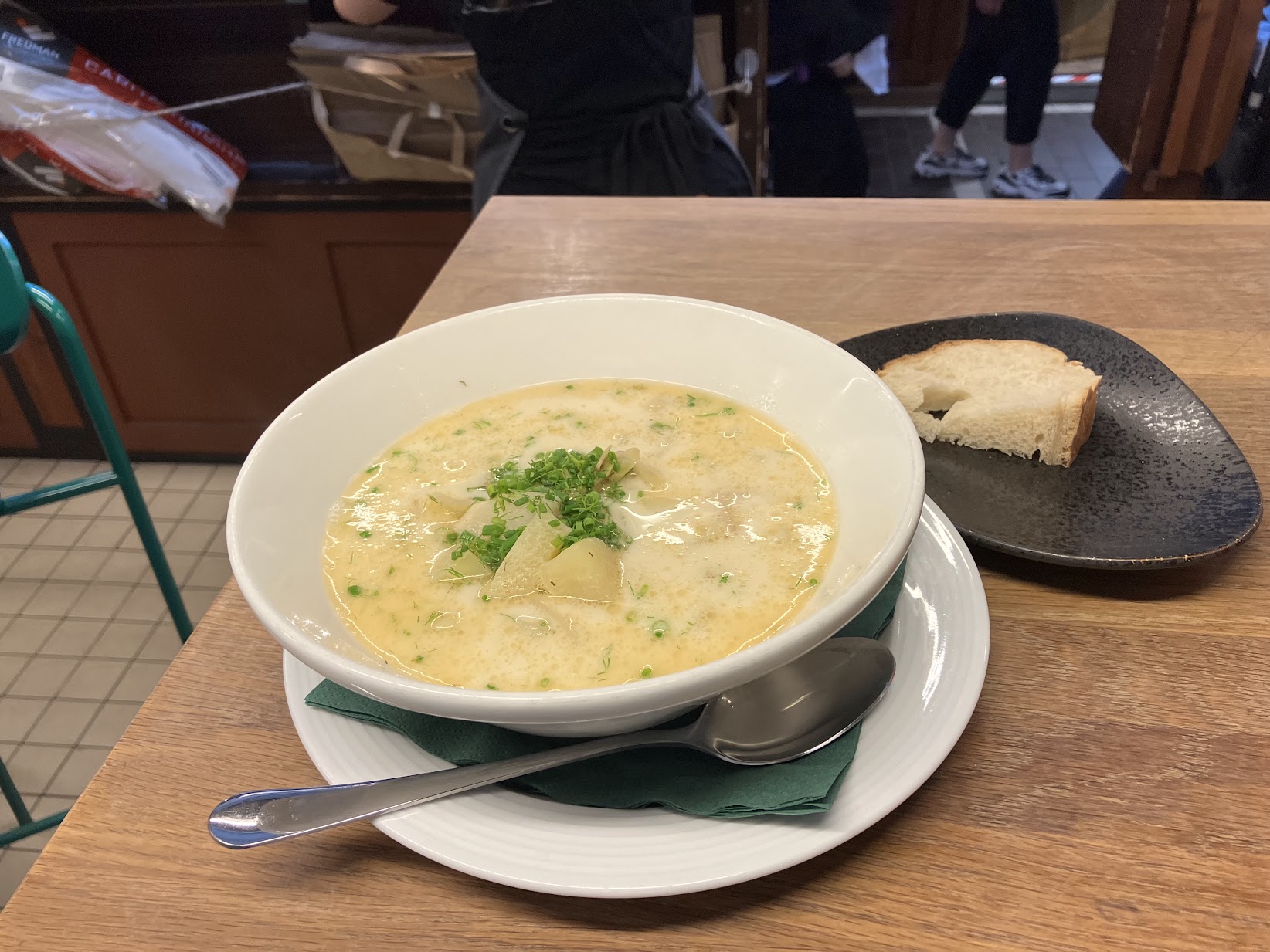 でもって、戻って、オールドマーケットホールで、サーモンスープ。