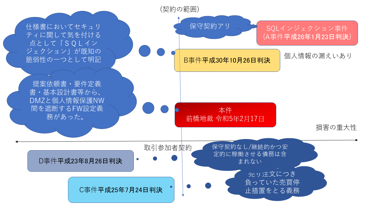 ここで、図の縦軸で、契約の範囲として記載されている上二つにおいては、仕様書に記載のある場合(平成26年1月23日判決)、保守契約がある場合(平成30年10月26日判決)がありますが、本判決においては、