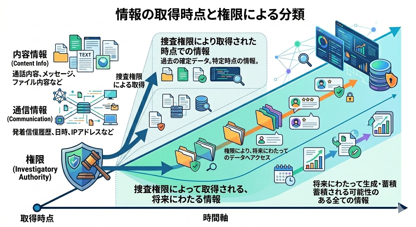 ここで取得しうる情報の種類というのは、情報については、何らかの捜査権限によって、取得されるとしても、その対象と時間の二つの観点から、分けることができるということになります。
