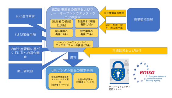 また、「デジタル要素を有するクリティカルな製品(critical product with digital elements)」という概念も定められています(8条・附属書Ⅳ)。これは、附属書Ⅳに記載されたカテゴリの中核機能を有するデジタル要素を有する製品です。具体的なものとしては、セキュリティボックス付きハードウェアデバイス、スマートメータゲートウェイや安全な暗号処理用を含む高度なセキュリティ目的のその他のデバイス、セキュアエレメントを含むスマートカード又は同様のデバイスが挙げられています。これらの製品については、委任法によって、「相当な(substantial)」保証レベル以上の欧州サイバーセキュリティ認証の取得を義務付けることができます(8条1項)。委任法が採択されるまでの間は、32条3項に定める適合性評価手続に服することになります。